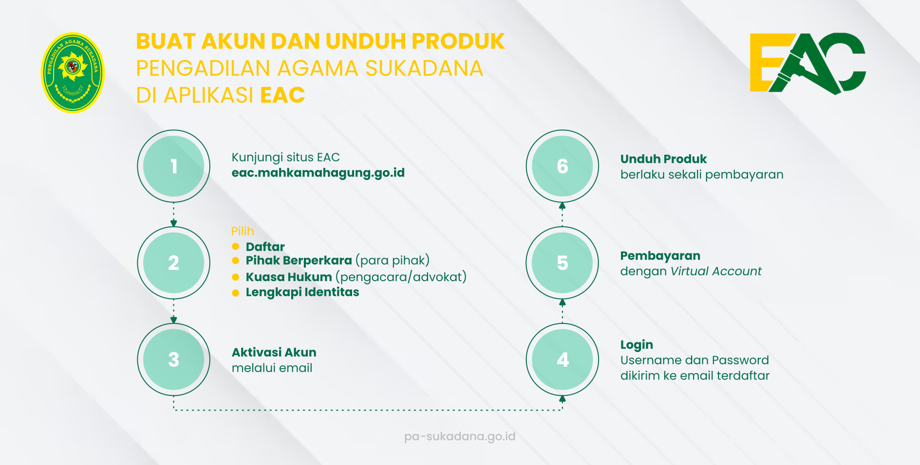 Pastikan Anda meminta bantuan petugas untuk pembuatan akun pada situs EAC Badilag guna mengunduh produk pengadilan secara elektronik.